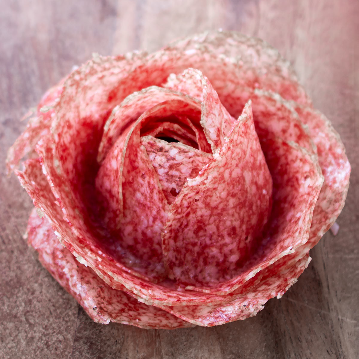 A salami rose consists of layers of thinly sliced salami, that are positioned, overlapping, and shaped in such a means that the salami slices appear like a rose.